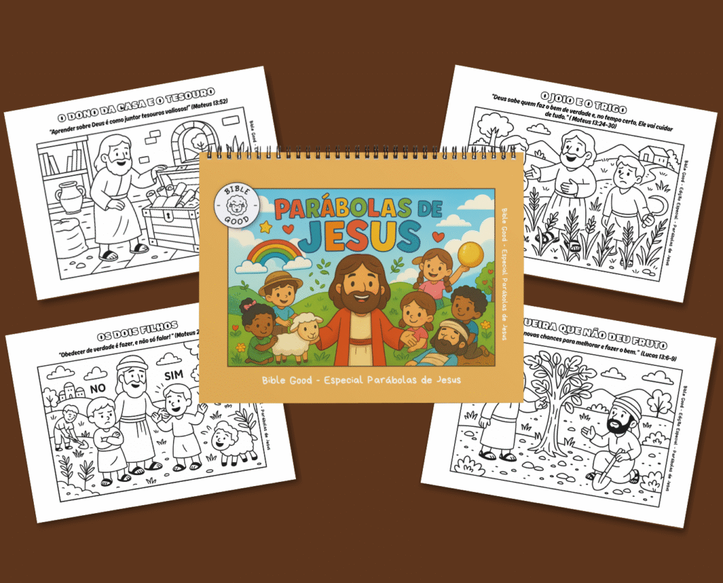 Esse material exclusivo traz As parábolas de Jesus em desenhos para colorir, no estilo Boobie Goods que as crianças amam.