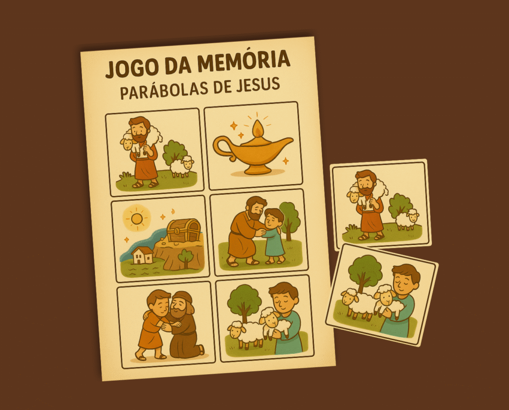 Cartinhas ilustradas com nomes e símbolos das parábolas para recortar, brincar e memorizar as lições da Bíblia com alegria.